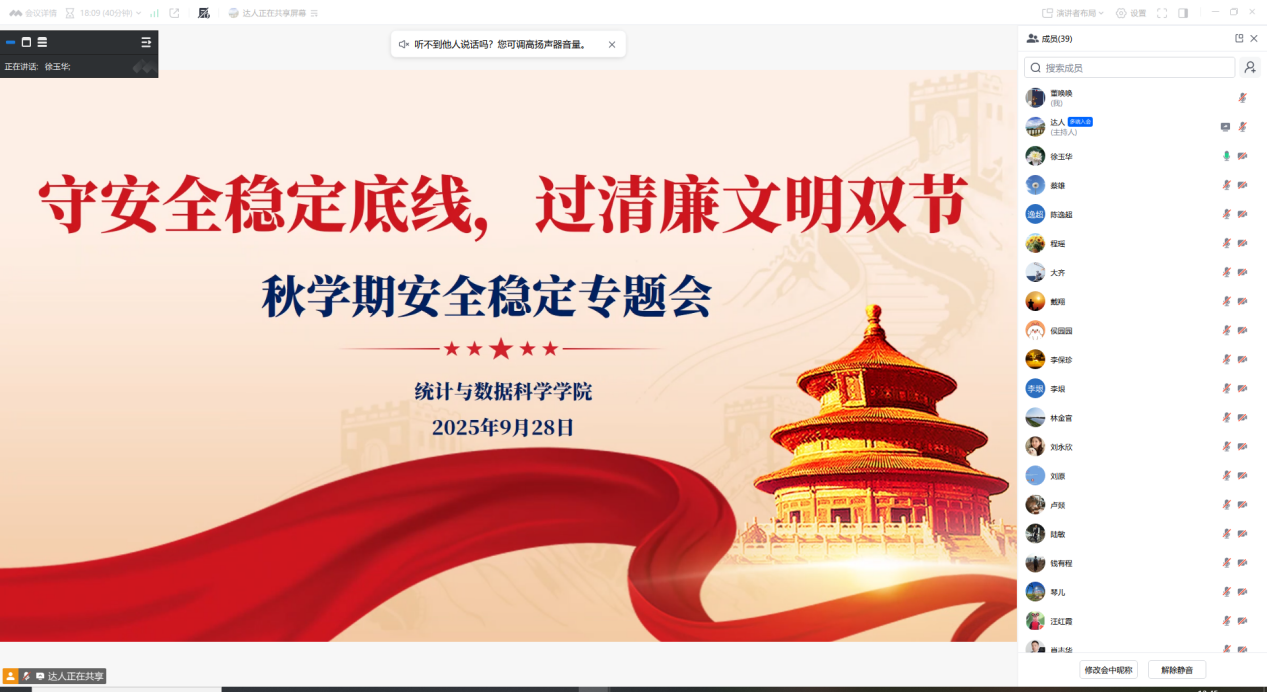 随后,会议就假期安全稳定工作作出具体部署。徐玉华从意识形态安全、人身安全、交通安全、消防安全、财产安全、出行安全等多个方面,对潜在风险隐患进行了分析,并就排查整治工作提出了明确要求。会议强调,安全稳定是公司发展的基石,全体教师必须牢固树立“安全第一”的责任意识,时刻保持高度警惕,严格落实各项防范措施,确保校园持续安全稳定。