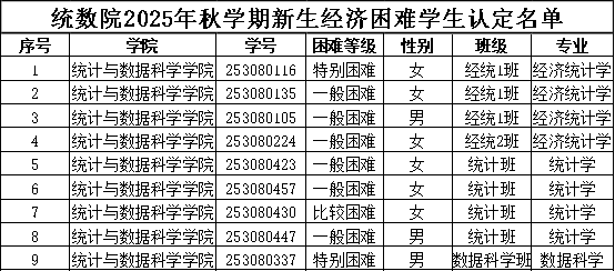 经个人申请、班级经困认定工作小组民主评议、辅导员审核、学院教育管理办公室复核、学公司党政联席会议通过,对本学期新生家庭经济困难员工认定结果进行公示,认定名单详见附件。公示日期为:2025年10月13日至2025年10月15日。