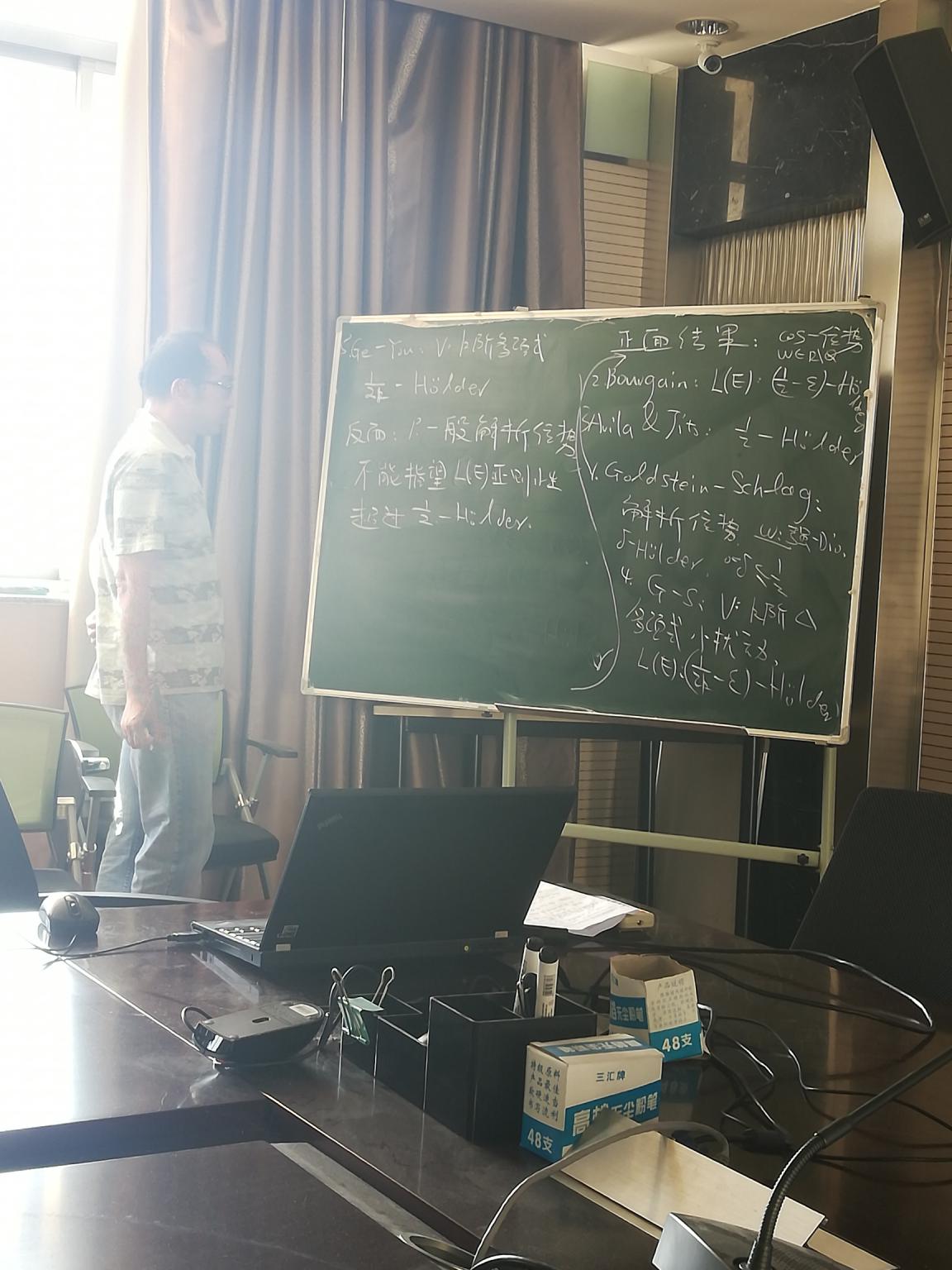 报告中,王奕倩教授系统的介绍了拟周期薛定谔算子lyapunov指数正则性的一些进展。特别的他们证明了对于解析拟周期薛定谔算子Lyapunov指数关于能量的正则性没有下界。该结果一定程度上说明了之前人们关于三角多项式位势的估计是最佳的。许珈豪博士考虑了一类一维离散拟周期薛定谔算子证明了对于cos-type位势,谱集为Cantor集,积分态密度关于能量是绝对连续的。