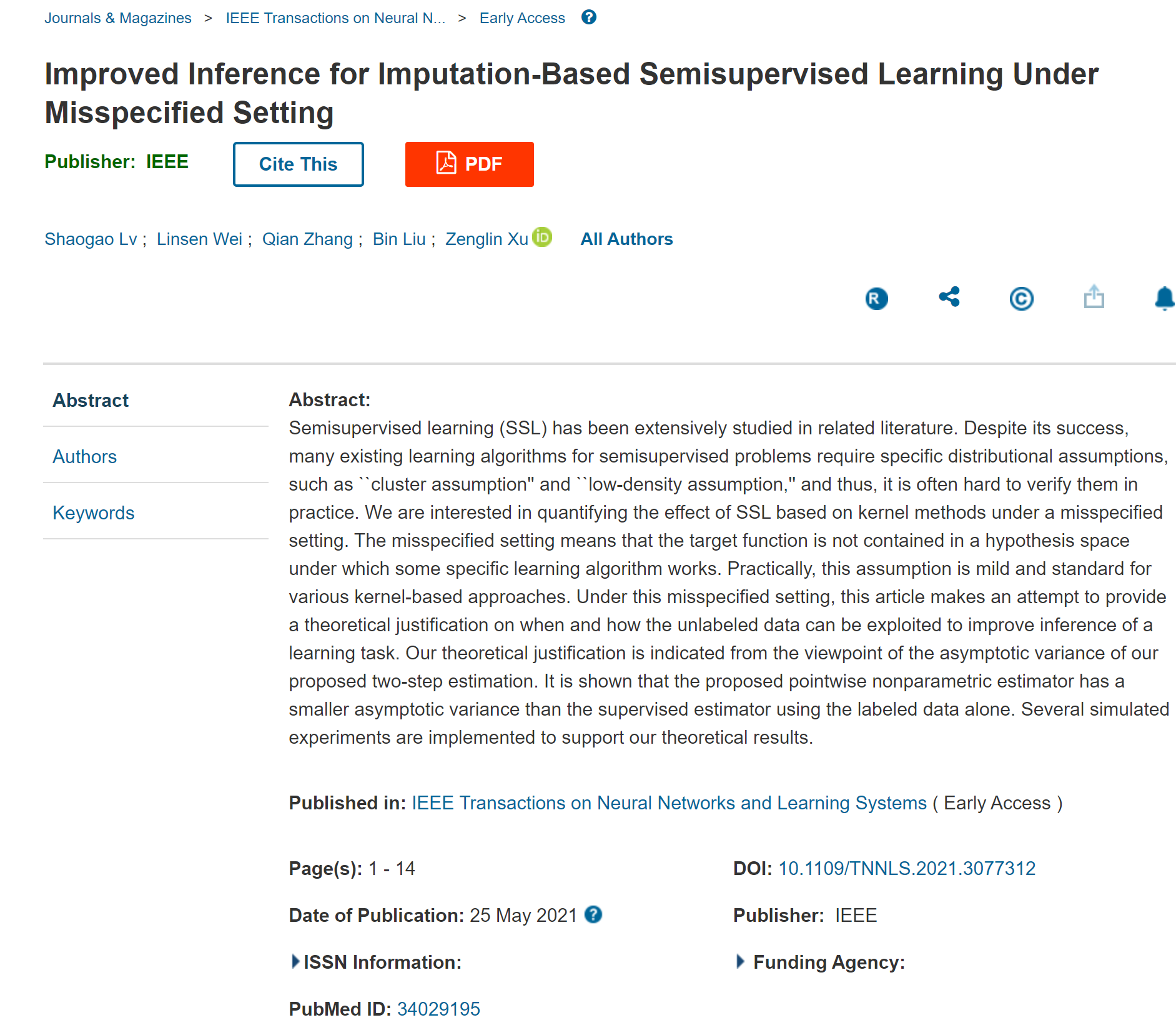 近期,公司硕士生魏琳森同学与其导师吕绍高教授以及校外学者合作在半监督学习方面取得重要的结果。所撰写的论文被人工智能领域SCI权威期刊IEEE TNNLS录用,论文题目为“Improved Inference for Imputation-Based Semi-supervised Learning Under Misspecified Setting”,其中第一作者是吕绍高,第二作者就是魏琳森,南审作为第一单位。 IEEE TNNLS英文全称:IEEE Transactions on Neural Networks and Learning System,科学引文索引影响因子为8.793,中科院分区一区(南审特别奖励期刊),以及汤姆森路透社分区Q1区的顶级期刊。