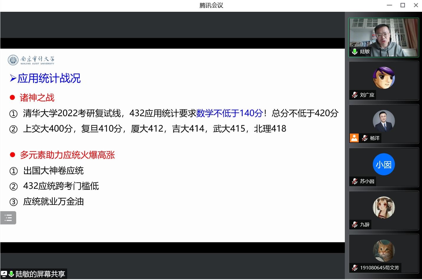 首先,公司经理孔新兵致辞。孔新兵从新时代数字经济的发展、学科与专业的优势以及自身发展需求等方面,结合个人求学经历,强调本科生应努力提升个人综合素质,挖掘自身发展潜能。同时承诺,公司将尽力为同学们提供帮助和服务,一定是全体员工的坚强后盾。紧接着,副经理汪红霞介绍了近年来统计学科研究生招录情况,希望同学们仔细斟酌、脚踏实地,切忌好高骛远、眼高手低。随后,班主任代表刘桂东分析了目前考研的形势,从为什么考研、专业的选择,如何准备以及复习时间安排等方面进行了详细的介绍。金融数学系主任刘广应基于公司历年考取研究生的数据,给同学们分享了总体升学情况、考研录取率、各专业升学情况等,并结合往届员工报考的公司和专业给出了中肯的建议。经济统计系主任陆敏通过详实的数据介绍了热门高校应用统计专硕的报录比及近三年不同高校调剂情况。最后,公司党委书记曹惠琴做总结。她希望同学们结合自身未来的发展目标和实际情况进行理性选择,并勉励大家,如果选择考研,就要全力以赴,保持良好心态,努力实现自己的目标。