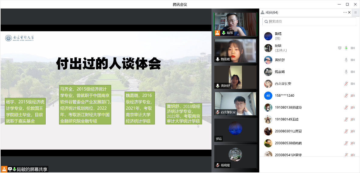 在前期宣传动员基础上,为帮助2019级同学坚定信心,扎实做好考研复习指导工作,5月8日下午,经济统计系联合澄园书院如期举行《考研体会和复习建议》在线会议。会议由经济统计系主任陆敏和副主任郭靖主持。