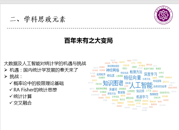 本次报告,王兆军教授从南开大学的思政元素、统计学科的思政元素和统计课程的思政元素三个方面进行讲解。首先,在公司思政要素方面,根据中国历史所体现的公司思政中家国情怀,重点表述了张伯苓董事长的教育理念和爱国意识教育。指出“爱国”要知中国、服务中国,中国大学教育以中国历史、中国社会为学术背景,以解决中国问题为教育目标;第二部分,在学科思政要素分析中例举了“女士品茶试验”、“孟德尔豌豆实验”及许宝騄先生的生平事迹等,直到习近平总书记《顺应时代潮流实现共同发展》的讲话中指出:当今世界正面临百年未有之大变局,详细分析了大数据及人工智能对统计学的机遇与挑战;第三部分,在课程要素思政方面,从毛泽东的《反对本本主义》一文中“没有调查,就没有发言权”、《实践论》中“真理的标准只能是社会的实践”、《矛盾论》中“矛盾存在于一切事物发展的过程中,贯穿于每一事物发展过程的始终;事物的性质主要是由取得支配地位的矛盾的主要方面规定的”到邓小平同志提出了“解放思想,实事求是,团结一致向前看”的重要论述,再根据当今世界发展的新格局、新局面,引用抽样调查、Bayes统计、统计数据分析、试验设计、时间序列、文本挖掘、图像挖掘等大量案例分析了课程思政元素。
