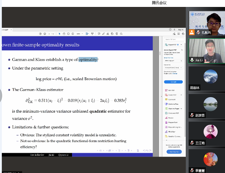 通过李嘉教授生动且详细的讲解,与会师生对基于高频数据的波动率估计有了更为深刻的认知。师生们与李嘉教授进行了热烈交流,并就波动率估计方面的很多现实问题进行了讨论,更加明确了进一步的研究方向,此次报告对以后的深入研究具有重要的指导和实践意义。