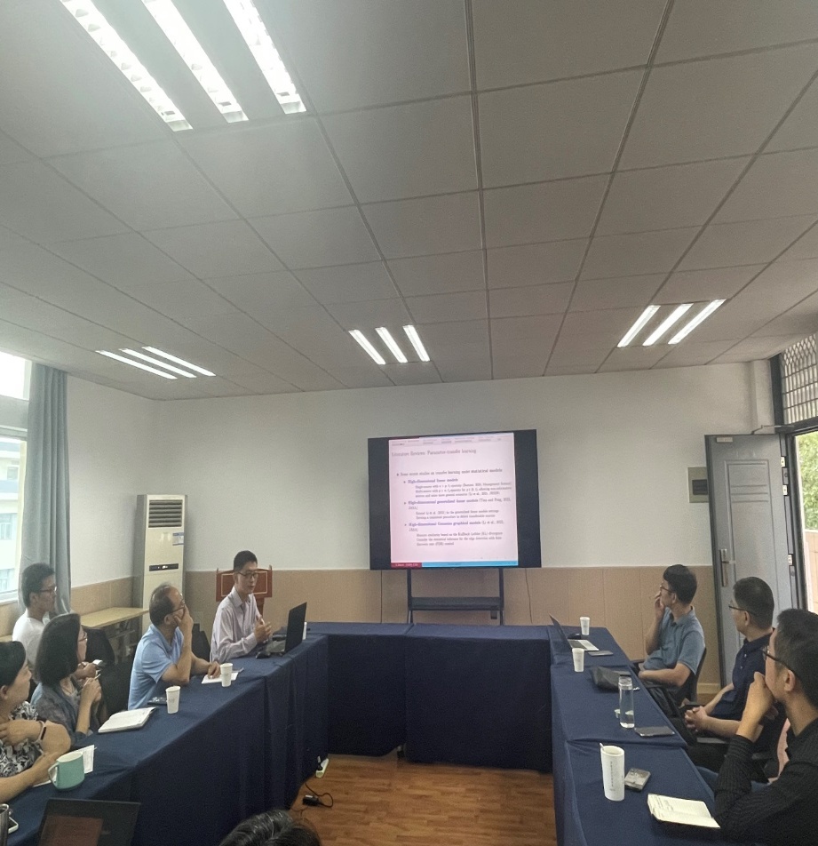 报告以迁移学习为主题,张新雨教授在报告中介绍了半参数模型平均的最优参数迁移学习,针对模型权重的选择进行了详细分析,从目标模型正确和误设两种情况介绍了模型的统计类性质,不论目标是否正确,迁移的风险都小于或等于不迁移的风险,因此避免了负迁移的影响。张教授还介绍了trans-SAIC、trans-SBIC等迁移方式以及参数的设置情况,为大家讲解了两个模型案例,即北京西南地区房租价格预测案例和金融贷款案例。他指出迁移学习与模型平均方法相结合,计算简便且能够起到隐私保护的作用,但是还需要进一步研究推断。