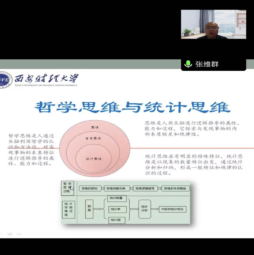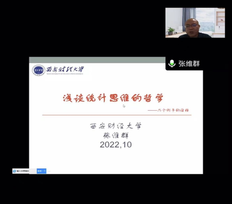 10月27日下午,西安财经大学统计公司经理张维群教授应邀为统计学科研究生及导师开展主题为“浅谈统计思维的哲学——几个例子的诠释”的学术讲座,活动采取线上会议形式进行,由江苏省政府统计与大数据研究院经理林金官教授主持。