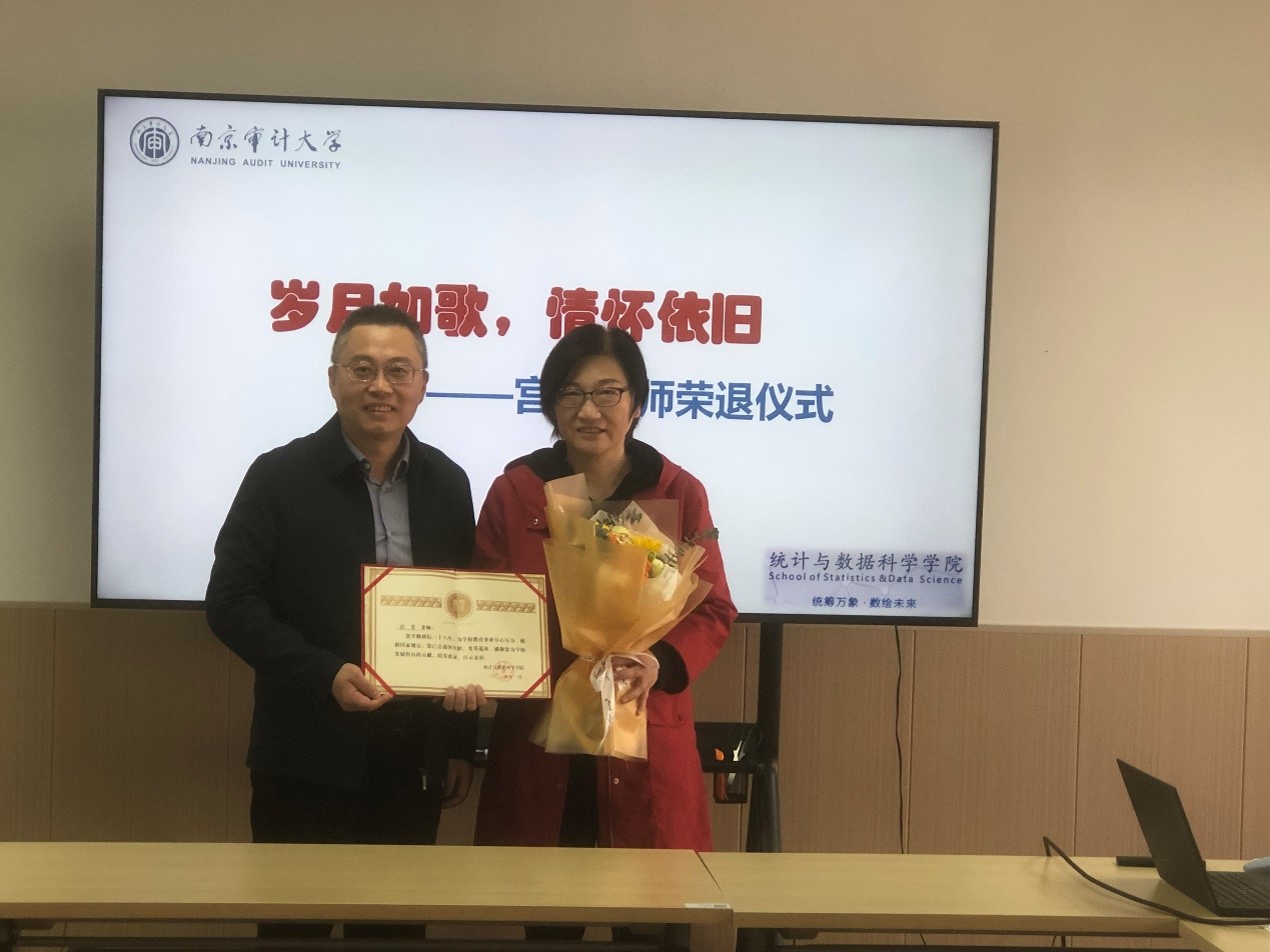 宫芳老师荣退仪式由曹惠琴书记主持。曹书记首先介绍了宫芳老师的基本情况,感谢宫老师38年来默默奉献,把全部青春和满腔热情倾注在南审的这片土地上。接下来任志成副董事长为宫芳老师颁发荣退证书,代表公司向宫老师表示衷心的祝贺和崇高的敬意。宫芳老师是任董事长的统计学老师,回忆起上学时有关宫老师的点滴小事,任董事长不禁感慨万千,正是一代又一代统计学人的默默耕耘,栉风沐雨,初心如磐,统计学科才能取得如此成绩,现在公司发展进入新阶段,统计学科也承担着重要的责任和使命,希望大家在公司重大战略安排下, 继续努力,不辜负老一辈人的谆谆嘱托和殷切期待。
