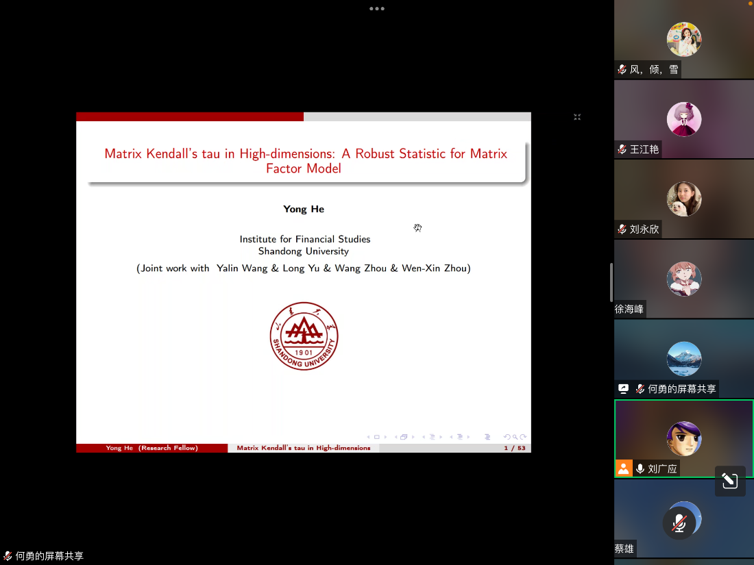 11月16日晚,山东大学金融研究院研究员何勇博士应邀为云顶国际yd333全体研究生及导师开展主题为“Matrix Kendall’s tau in High-dimensions: A Robust Statistic for Matrix Factor Model”的学术讲座。活动采取线上形式进行,由云顶国际yd333刘广应教授主持,公司全体研究生及导师参加。