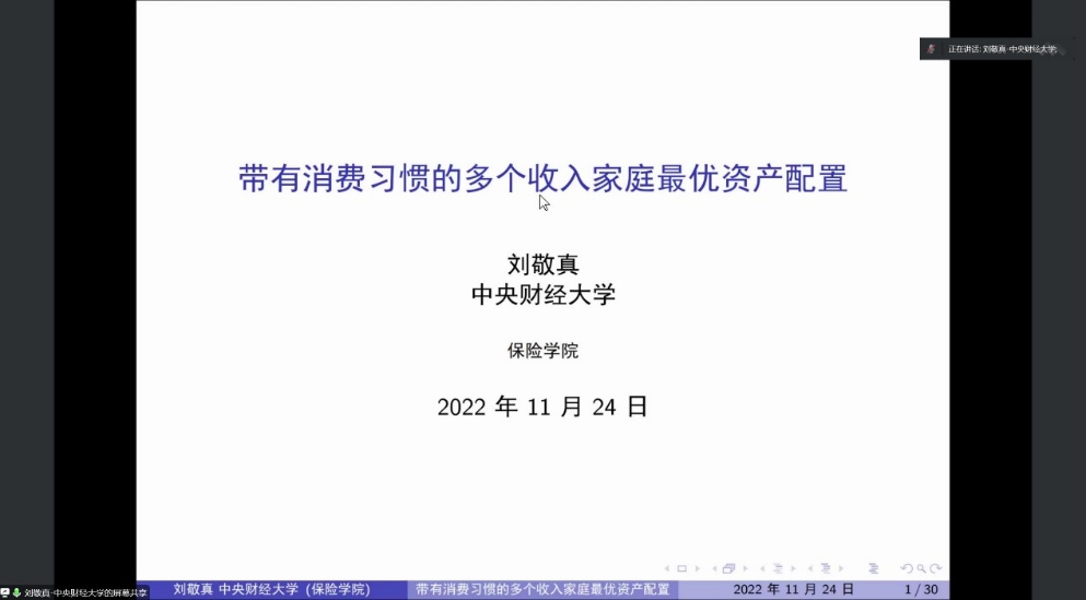 会议的第二阶段是刘敬真教授以“带有消费习惯的多个工资收入家庭最优资产配置”为主题进行专题报告。