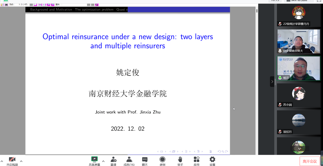 12月2日晚,南京财经大学金融公司副经理姚定俊教授应邀为统计学科研究生及导师开展金融统计与精算学方向的学术讲座,主题为“多个再保险人参与下的最优双层混合再保险设计”,活动采取线上会议形式进行。由云顶国际yd333副书记、副经理杨洋教授主持。
