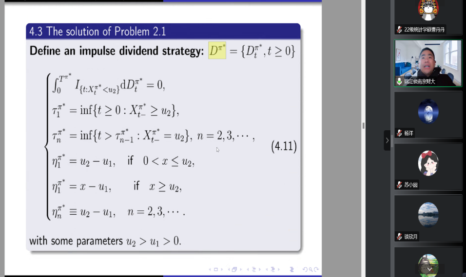 首先,姚定俊教授分享了该研究的问题背景以及动机。经典的股息问题在于找到最大化公司价值的股息策略,该策略由破产前的预期贴现股息总额定义。针对最优股息问题、最优股息与再保险问题和最优股息与再融资问题以及最优股息、再保险和再融资问题的融合,层层推进,不断的深化研究,再加上现有文献仅仅单方面考虑股息、再融资和超额损失再保险策略,或者只考虑股息、再融资和比例再保险策略,而且只针对两个再保险人情况下研究指数溢价原理、方差溢价原理和期望溢价原理。目前的研究并没有一个既有比例再保险又有超额损失再保险的混合模型,并且可以推广到任意多个再保险人的情况。基于以上的思考,姚定俊教授提出“多个再保险人参与下的最优双层混合再保险设计”。