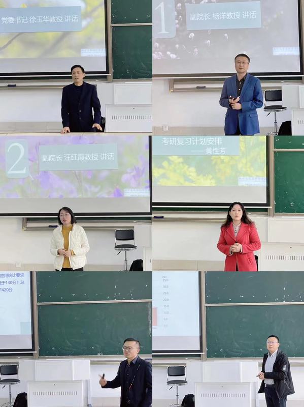 徐玉华从国家、公司、公司、个人四个层面分析了考研的现实情况,他用“决心、信心、耐心、恒心”四心勉励同学们坚定信念、成就梦想。杨洋分析了公司统计学、经济统计学专业近三年的考研录取情况,建议大家明确目标定位,加强沟通交流,脚踏实地尽早准备。汪红霞围绕专业选择、朋辈互助、强健体魄、树立信心等方面与同学们分享交流。黄性芳对院校选择、制定复习计划以及各门课程的初试准备都提出了具体建议。郭靖结合往届同学报考的公司、专业和分数,对同学们的院校选择、专业选择提出了中肯的建议。陆敏对参考书选择、院校选择、调剂情况做了详细介绍,建议同学们理性选择。