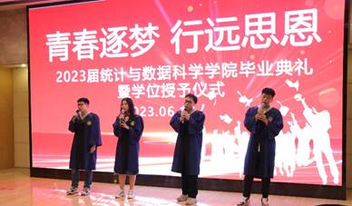 2020级统计学学硕的林佳男、李新尧、火悦、毛义之同学为大家献上了合唱《知足》。四位同学携手演唱,表达了对母校、对老师、对同学的感恩之情,鼓舞同学们珍惜现在,追求未来。