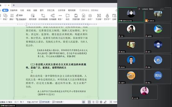 本次专题学习由周喜林同志和侯婷婷同志分别带领大家,采用读原文的方式集中学习了《习近平新时代中国特色社会主义思想专题摘编》第八章《推进社会主义民主政治建设,发展社会主义政治文明》和第九章《坚持全面依法治国》的内容。