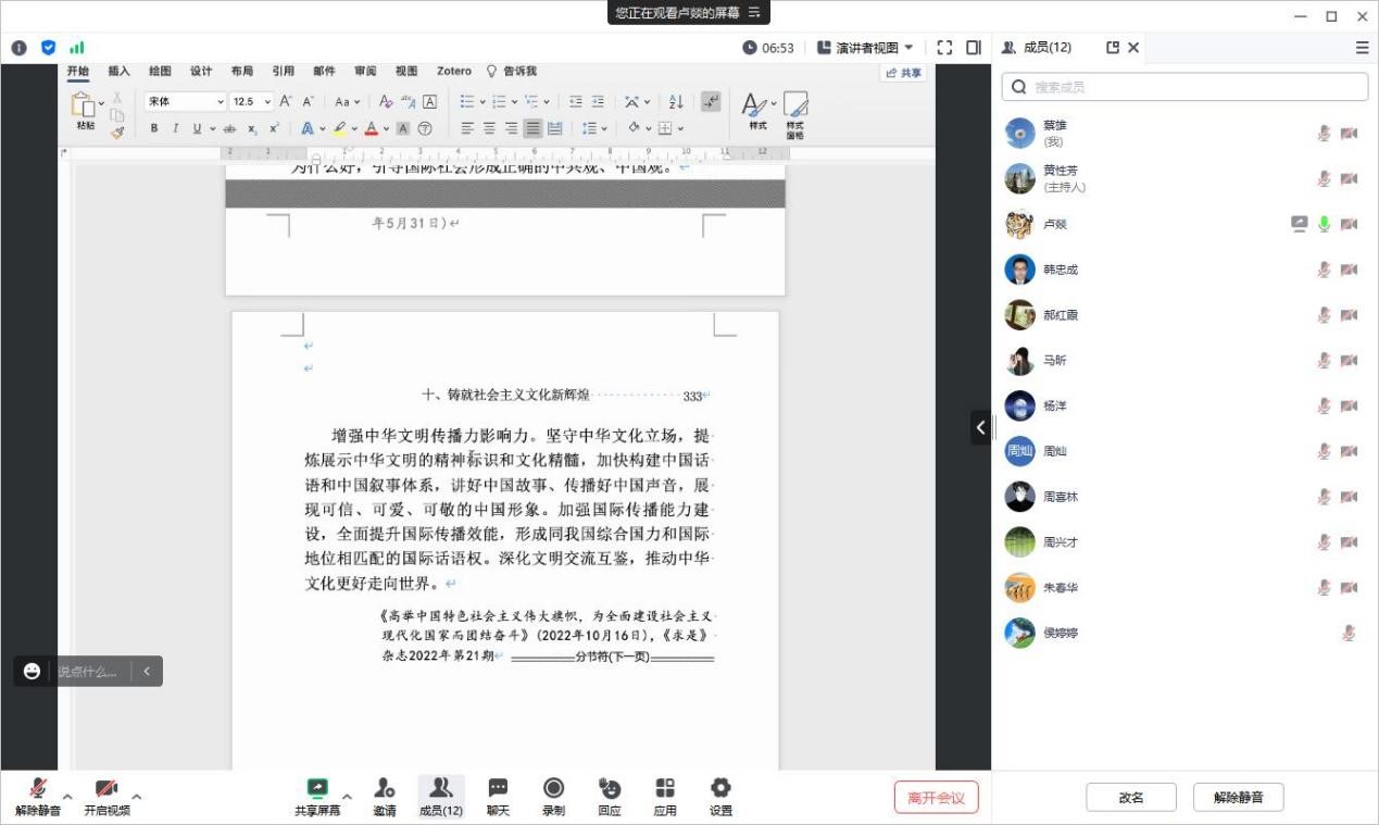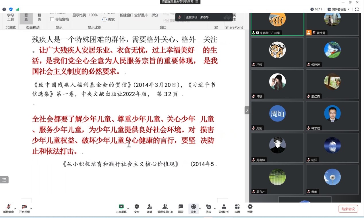 随后,由卢燚同志和朱春华同志分别带领大家集中学习了《习近平新时代中国特色社会主义思想专题摘编》第十章《铸就社会主义文化新辉煌》和第十一章《坚持在发展中保障和改善民生》的内容。