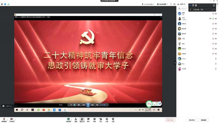 根据统计学系教工党支部主题教育工作安排,2023年7月21日,支部开展“党的二十大精神筑牢青年信念思政引领铸就审大学子”线上专题党课,引导支部党员同志深入学习贯彻把握党的二十大精神,推进党的二十大精神融入思政课程,着力增强高校员工思想引领实效。支部全体党员参加研讨学习。