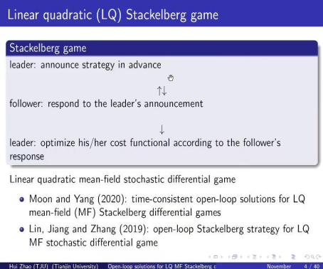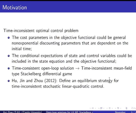 11月22日20点,天津大学数学公司赵慧博士为公司师生作了一场主题为“Time-consistent open-loop solutions for linear quadratic mean-field type Stackelberg differential games and its application in pension management”的线上学术报告。本次报告由云顶国际yd333副经理杨洋教授主持,云顶国际yd333研究生参加了此次讲座,讲座以腾讯会议形式进行。