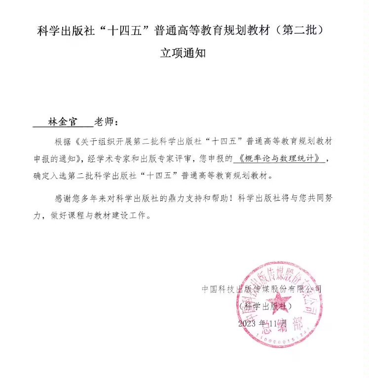 近日,科学出版社公布了“十四五”普通高等教育规划教材(第二批)立项名单,公司林金官教授申报的《概率论与数理统计》,确定入选第二批科学出版社十四五普通高等教育规划教材。