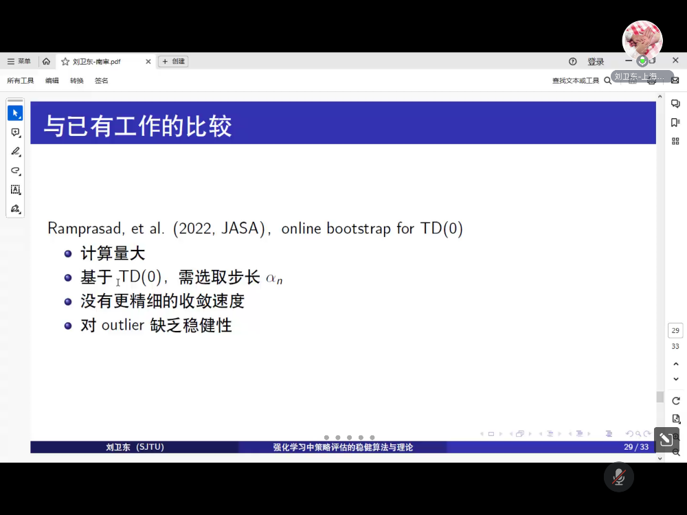 本次讲座的主题是“Online Estimation and Inference for Robust Policy Evaluation in Reinforcement Learning”。在讲座中,刘卫东教授首先介绍了强化学习的学习背景,通过冰湖问题和山地车问题两个实例进一步讲解强化学习的概念机理。与传统机器学习文献不同,刘卫东教授的研究侧重于对使用强化学习算法计算的参数估计进行统计推断。许多现有的分析都基于假设随机奖励遵循标准分布,从而局限了它们的适用性。为了解决这一问题,他在统一框架内同时处理了outlier contamination和heavy-tailed rewards的问题,引入了强化学习中robust statistics的概念。提出了一种在线稳健策略评估过程,并基于其Bahadur表示建立了估计量的极限分布。此外,他们还设计了fully-online的过程,以高效地进行基于渐近分布的统计推断。这一研究弥补了强化学习中稳健策略和统计推断之间的鸿沟,为策略评估提供了更为可靠的方法。