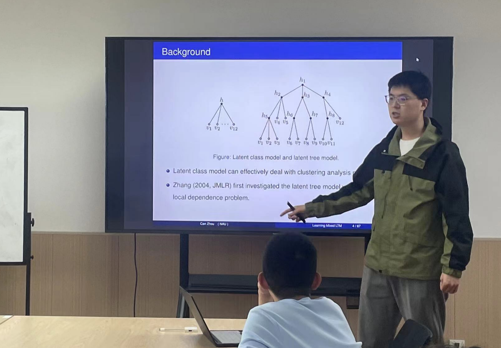 周灿老师报告的题目是《Learning Mixed Latent Tree Models》。在报告中,周灿老师指出,大多数现在结构模型学习中,只关注所有变量都是连续型,或者所有变量都是离散型的问题。然而在实际应用中,数据基本都是离散型和连续性的。因此在这篇论文中,考虑了混合数据挖掘的混合隐树模型。解决了这些混合模型的结构学习和参数估计问题。对于结构学习,提出了一致的自下而上算法,并给出了精确结构恢复的有限样本界保证。对于参数估计,利用矩阵分解提出了一个矩估计量,并证明了估计量的渐近正态性。在模拟数据和真实数据上的实验表明,该方法对于挖掘层次结构和潜在信息是有效的。