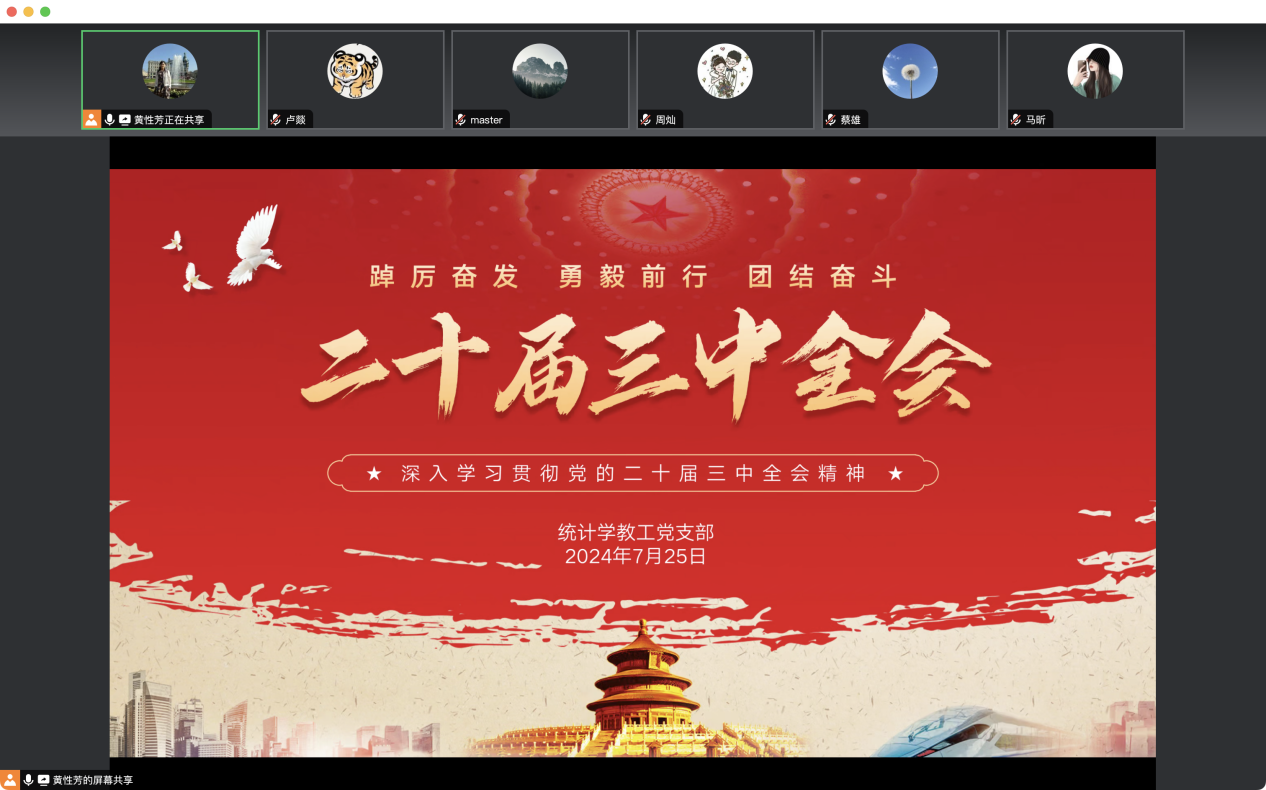 7月25日下午,统计学系教工党支部召开了专题会议,深入学习贯彻党的二十届三中全会精神。此次会议严格按照公司关于深入学习党的二十届三中全会精神的要求进行,党支部全体成员参与了学习,会议由支部书记黄性芳主持。