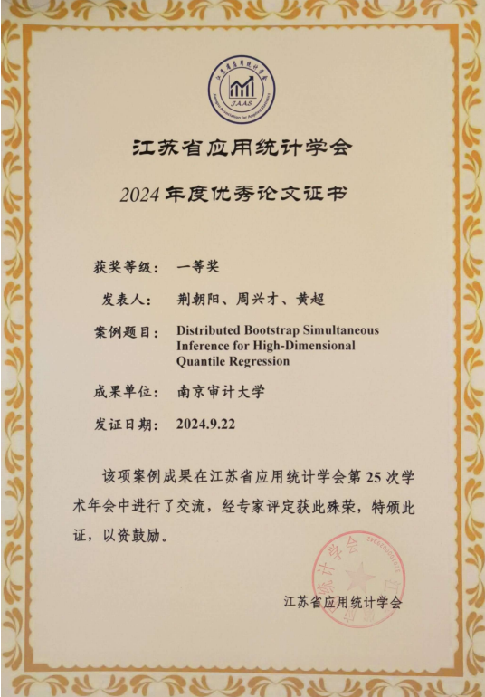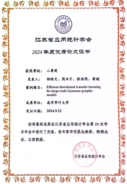 江苏省应用统计学会第 25 次学术年会于2024年9月20-22日在南京理工大学召开。公司周兴才教授指导的博士研究生荆朝阳同学的论文“Distributed Bootstrap Simultaneous Inference for High-Dimensional Quantile Regression”获得大会优秀论文一等奖、硕士研究生郑皓天同学的论文“Efficient distributed transfer learning for large-scale Gaussian graphic models”获得大会优秀论文二等奖。