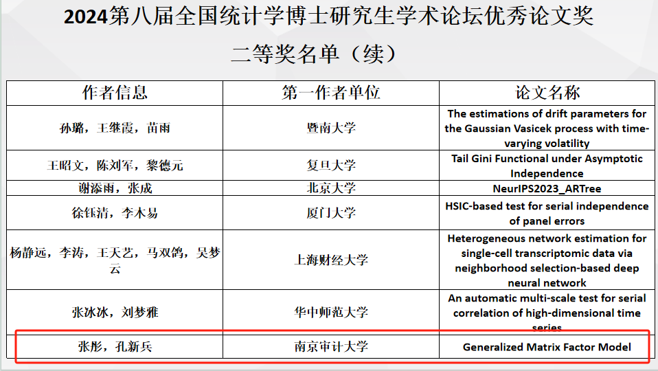 2024年9月20-22日第八届全国统计学博士研究生学术论坛在广州大学召开。论坛期间,来自北京大学、清华大学、中国人民大学等高校的60位统计学博士分别围绕相应的主题 作了学术报告,最终经专家组评选,共产生一等奖6名,二等奖15名,三等奖25名。公司博士研究生张彤同学在此次会议做了学术报告,其在导师孔新兵教授指导下完成的论文 “Generalized Matrix Factor Model” 荣获大会优秀论文二等奖。
