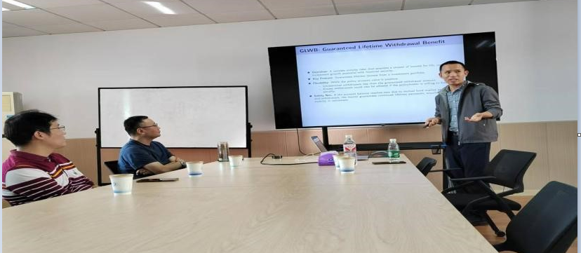 本次讲座中,张志民教授共作了两场报告。在报告《基于长期护理选项的终身提取利益保证的估值》中,他介绍了保证终身提取福利(GLWB)年金产品及长期护理选项的概念,并详细阐述了如何将投保人的健康状况明确纳入GLWB年金产品的估值过程。随后,在报告《具有最低身故利益保障的联合寿险变额年金的设计与估值》中,张教授提出了一种基于双生命联合生存状态的具有最低身故利益保障(GMDB )的变额年金评估方法,通过二元拉盖尔级数展开式与投影法结合,得出了三种GMDB条件的封闭式公式,并展示了其方法的高效率和高精确性。