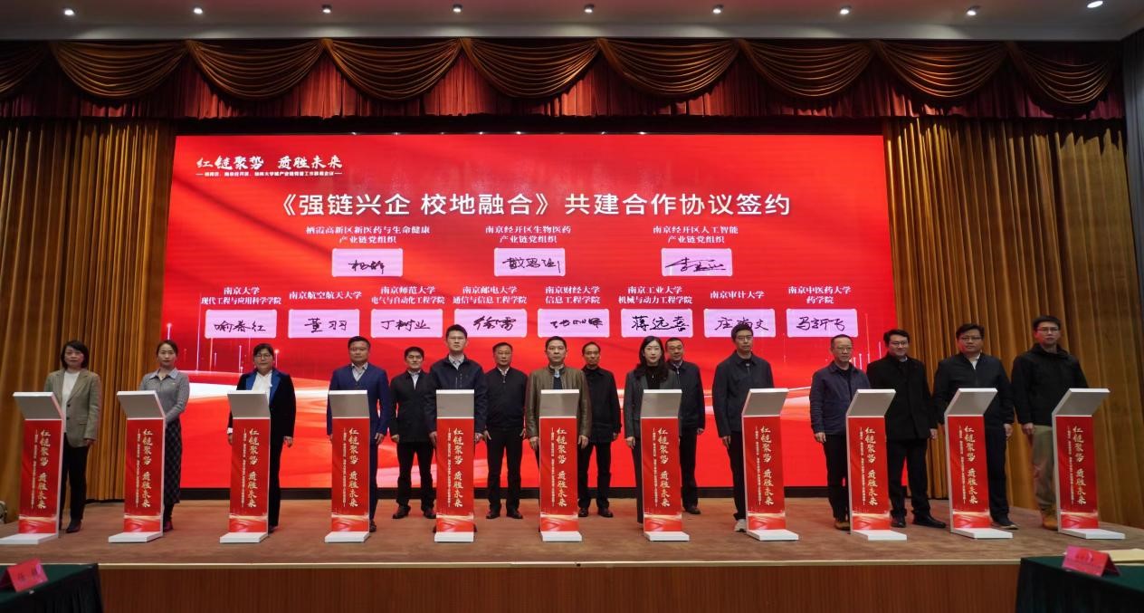 会上,栖霞区、南京经开区6个产业链党组织与驻地16所高校81个二级公司签署了《强链兴企校地融合》共建合作协议。公司党委与南京经开区人工智能和新医药与生命健康两个产业链党组织签订共建协议。未来,公司党委将进一步深化对接与共建工作,将高校的人才、科技创新等资源有效整合并融入产业链中,以更加深入和高效的方式推进校地产学研合作,促进科技成果的落地转化,实现互利共赢的新局面。