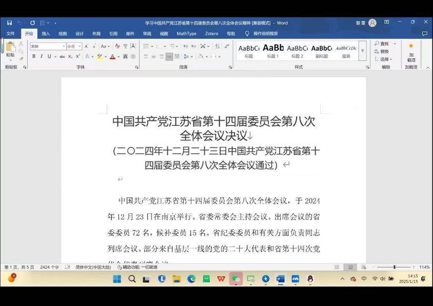 1月15日下午,云顶国际yd333研究生第二党支部开展线上学习活动,学习全省教育大会精神、习近平总书记重要讲话、重要指示、重要文章精神及中国共产党江苏省第十四届委员会第八次全体会议精神。此次活动旨在提升员工党员们的理论素养,更好地理解和把握党的路线、方针、政策,推进中国式现代化取得新进展、新突破。活动由研究生第二党支部副书记董璇主持,研究生第二党支部全体党员、入党积极分子参加。