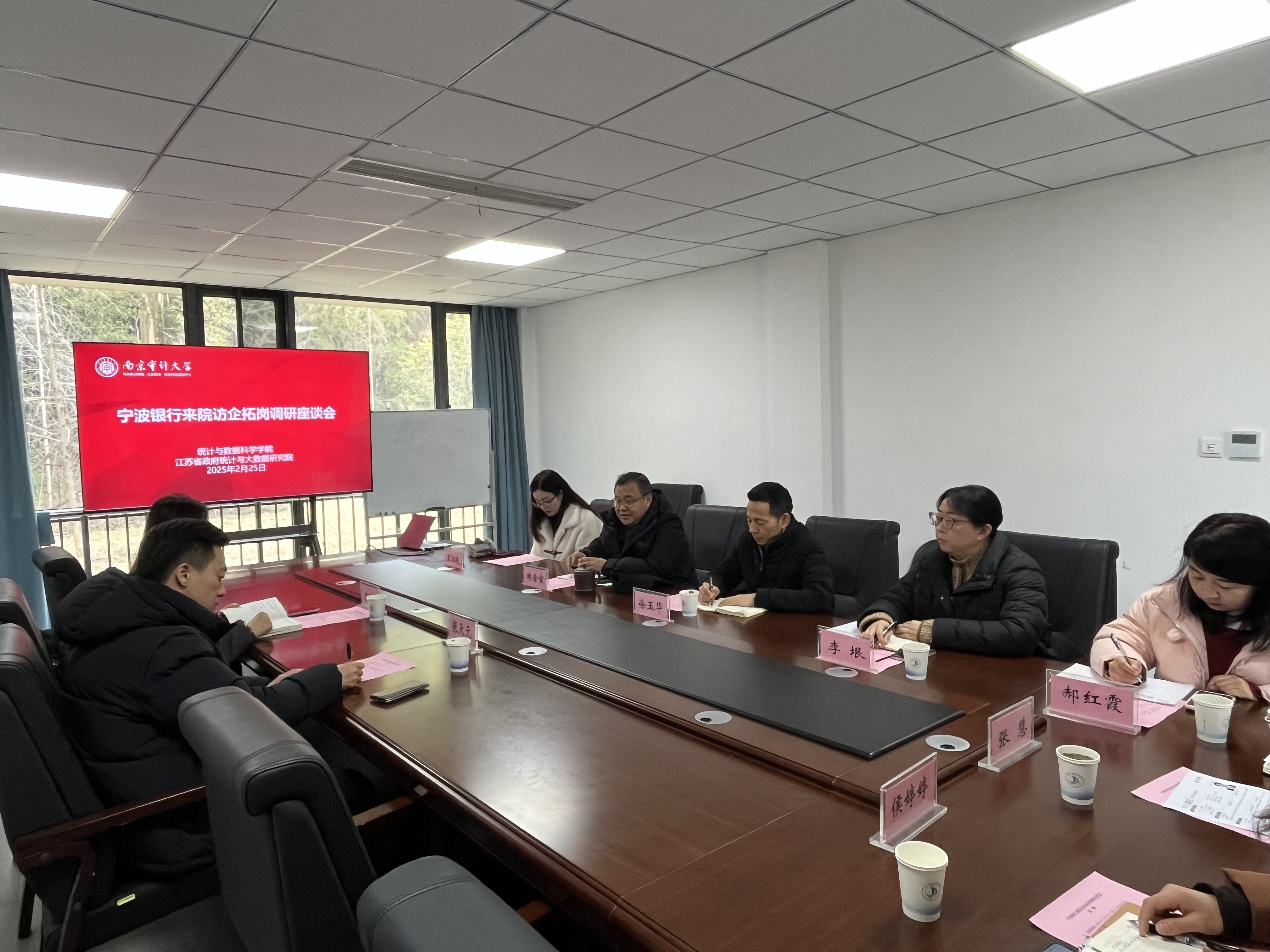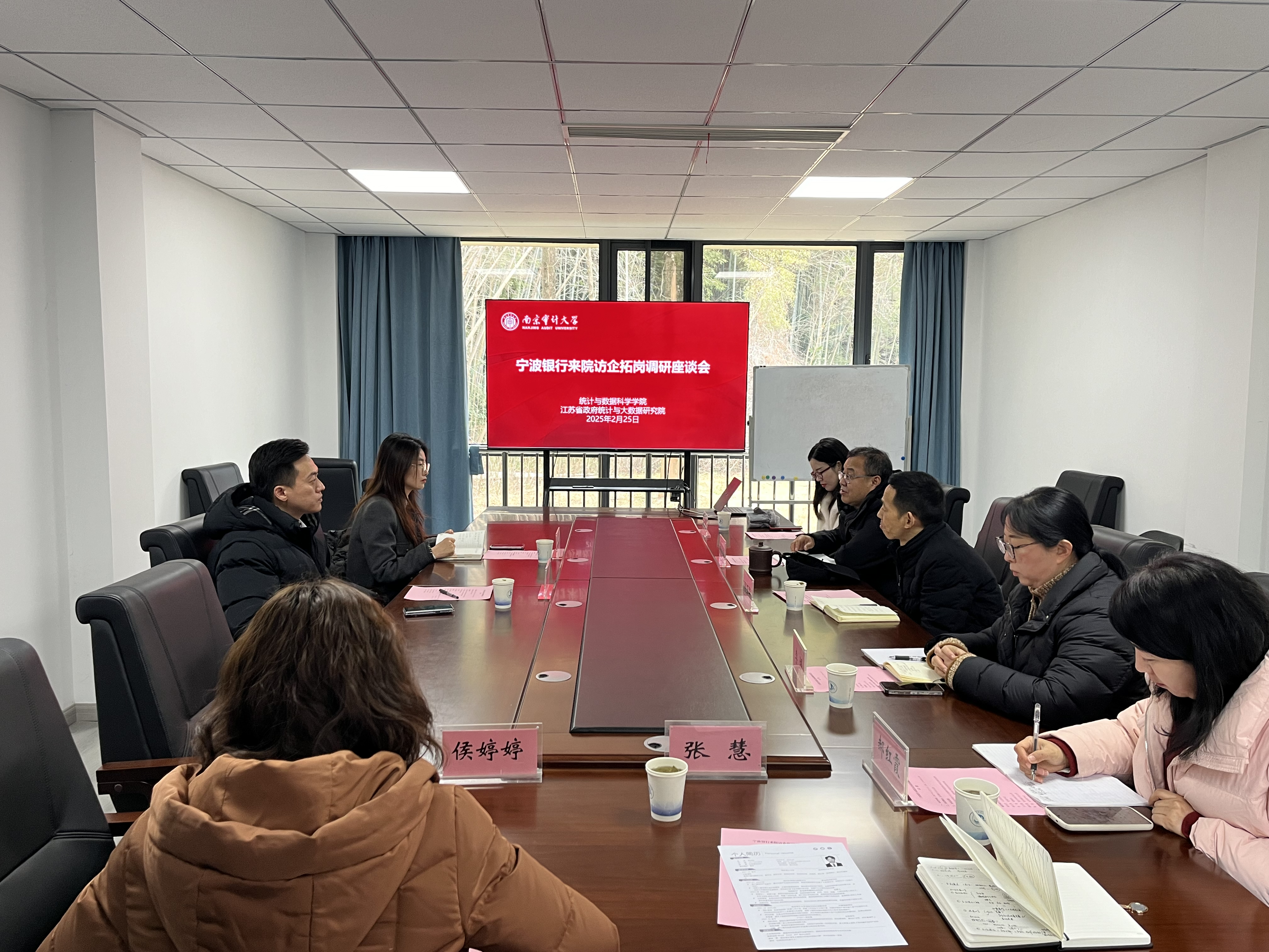 为进一步深化校企合作,拓宽就业渠道,助力公司毕业生高质量就业,2月25日,公司邀请宁波银行南京分行城南支行行长张天元、部门经理潘盼盼来院开展访企拓岗调研座谈会。江苏省政府统计与大数据研究院经理林金官教授、公司党委书记徐玉华、副经理李垠、系主任、分团委书记、研究生辅导员参加了活动。