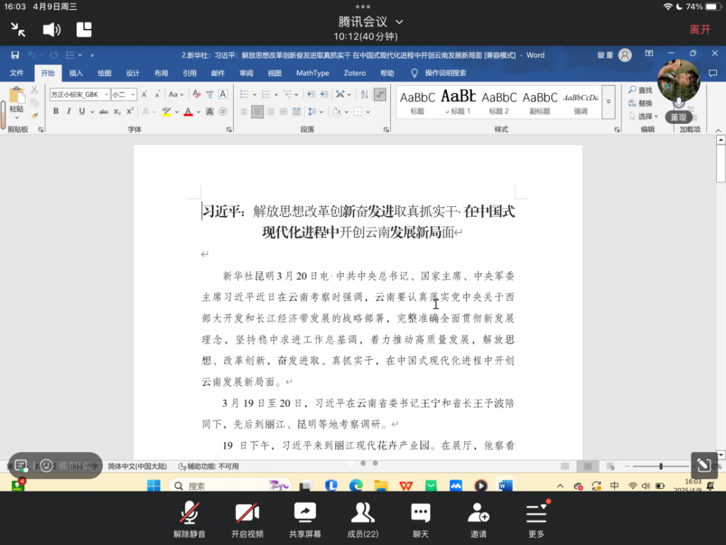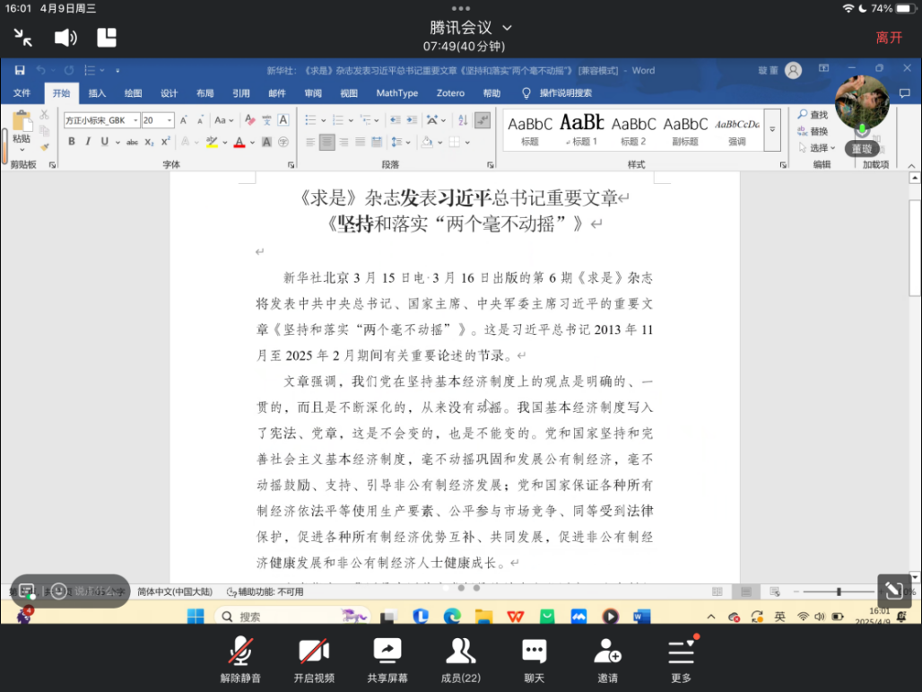 4月9日下午,云顶国际yd333研究生第二党支部通过腾讯会议召开支部学习会,深入学习习近平总书记近期在贵州、云南考察时的重要讲话精神及《求是》杂志发表的《坚持和落实“两个毫不动摇”》重要文章,结合全国两会精神展开交流研讨。会议由党支部副书记董璇主持,支部全体党员参加。