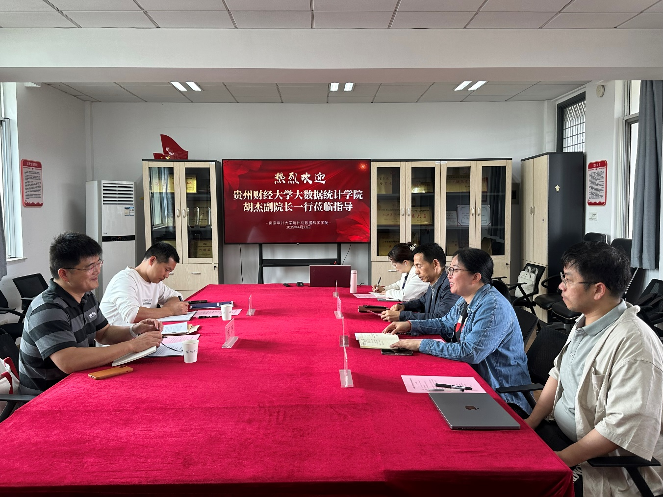 4月22日,贵州财经大学大数据统计公司副经理胡杰率队来院调研,公司党委书记徐玉华、副经理李垠、数据科学系主任黄性芳、副主任卢燚接待来访并座谈交流,会议由李垠主持。