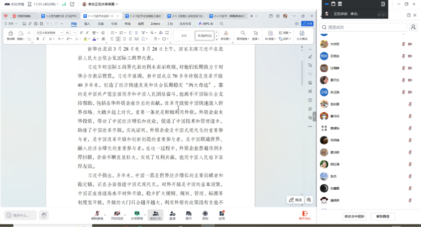 在本次线上学习的尾声阶段,季吉同志还介绍了习近平总书记在人民大会堂会见国际工商界代表的讲话内容。习近平总书记指出,外资企业是中国式现代化的重要参与者,也是高水平开放的重要推动者。他重申“外资政策没有变也不会变”,中国始终坚持打造法治化、国际化、便利化的一流营商环境,并将在规则、标准、管理等制度型开放方面持续发力。