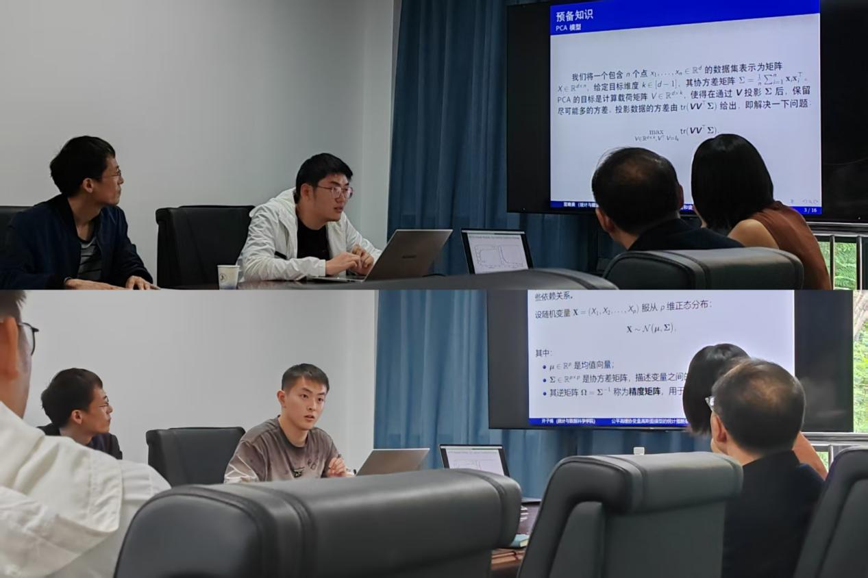 汇报阶段,许子楠硕士就数据中涉及到敏感性变量加剧异质性问题的复杂性,而不能简单地将所有数据合并进行统一建模问题,报告了公平高斯图模型的多目标推断;范晓辰硕士从如何保证PCA算法的公平性、如何在兼顾公平性的同时保证算法的计算效率和对提出的公平PCA算法给出统计学上的保证三个问题出发,报告了PCA公平学习算法和设计研究。