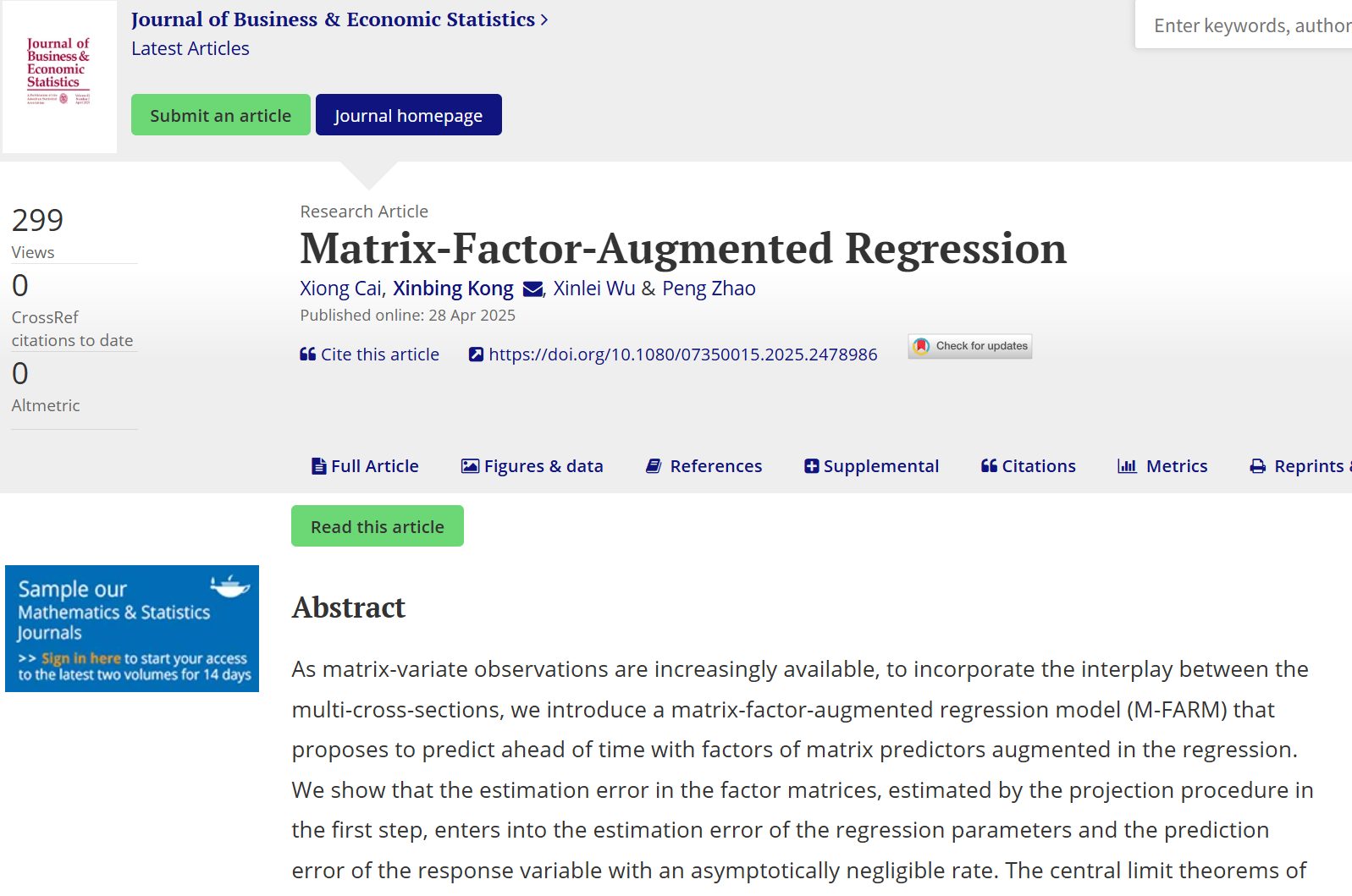近日,云顶国际yd333青年教师蔡雄、孔新兵教授、江苏师范大学数学与统计公司赵鹏教授与云顶国际yd3332021级硕士毕业生吴昕磊合作完成的学术论文“Matrix-Factor-Augmented Regression”在线发表于统计学与计量经济学国际权威期刊Journal of Business & Economic Statistics。该期刊科学引文索引影响因子为5.0,中科院分区二区,以及WOS期刊SCI分区Q1区。