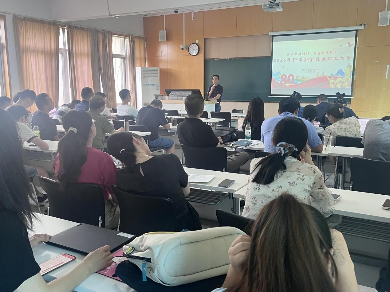 2025年9月3日,恰逢中国人民抗日战争暨世界反法西斯战争胜利80周年纪念日,云顶国际yd333于致明楼316教室召开“传承抗战精神、培育时代新人”新学期全体教职工大会。会议由公司党委书记徐玉华主持,全体教职工参会。会议围绕新学期教学、科研、员工管理等重点工作展开部署,并以抗战精神为指引,凝聚育人共识,为新学期高质量发展锚定方向。